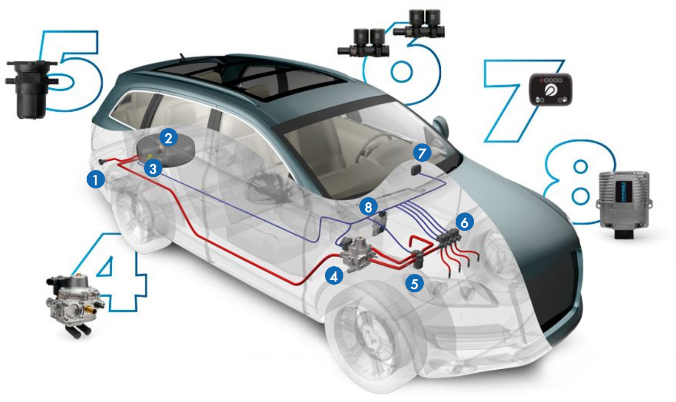 - Reducer: This is the device through which liquid gas is turned into gaseous phase, by reducing and adjusting its pressure in the engine.